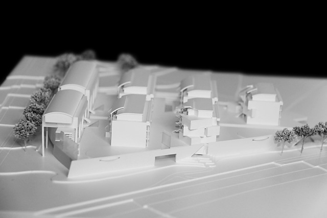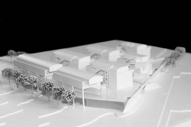 Die Bauten sind auf die Kantonsstrasse ausgerichtet, entsprechend den gegenüberliegenden Strukturen. Geschützt werden sie mit einer leicht gebogenen Glas-Schallschutzstruktur. Einzelne Gebäude sind am Rande aufgelöst und abgedreht. Sie reagieren so auf die teils angrenzenden losen Bebauungsmuster.